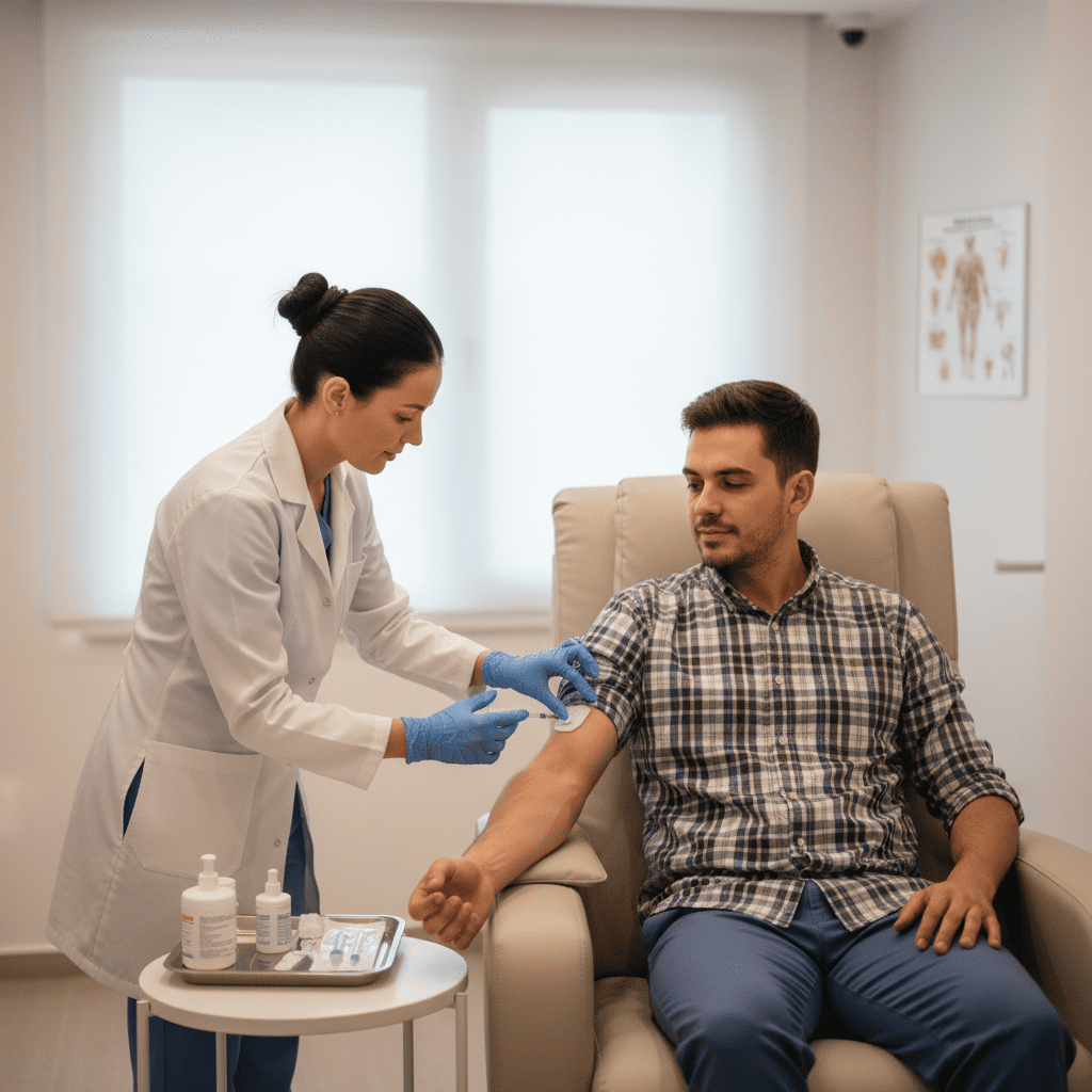 Aplicación segura y profesional de medicamentos inyectables, realizada por personal de salud capacitado, cumpliendo protocolos médicos y de bioseguridad en la comodidad de tu hogar.